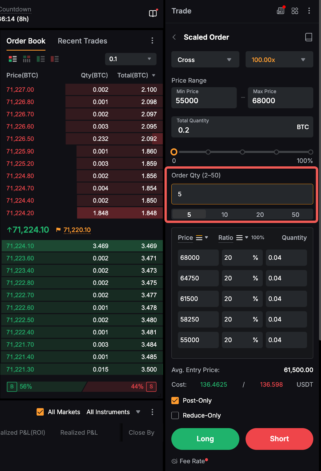 Harap dicatat bahwa total kuantitas minimum dan maksimum untuk Pesanan Berskala adalah 10 kali ukuran pesanan minimum dan maksimum. Contoh, ukuran pesanan minimum dan maksimum untuk BTCUSDT adalah 0,001 BTC dan 100 BTC. Alhasil, total kuantitas pesanan minimum dan maksimum untuk Pesanan Berskala masing-masing adalah 0,01 BTC dan 1000 BTC.