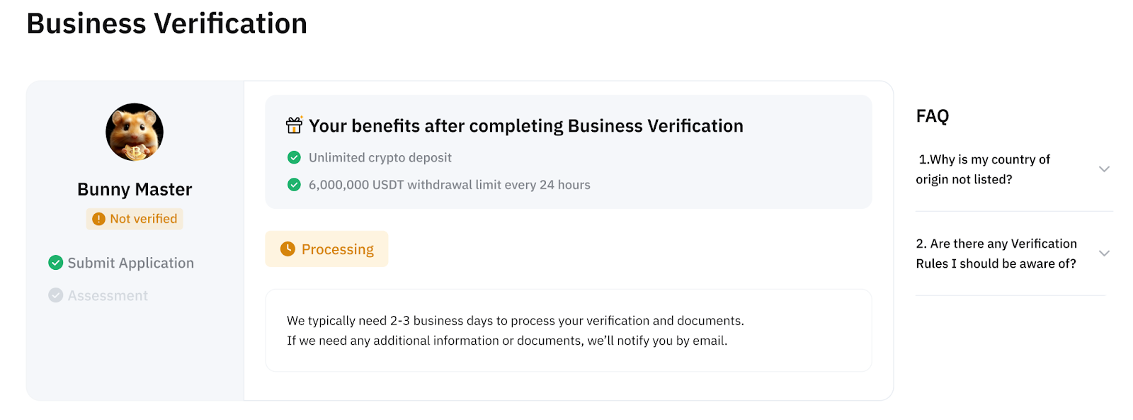 法人向け本人確認認証で問題が発生した場合は、compliance@bybit.comまでお問い合わせください。該当チームは、1営業日以内にご連絡いたします(1営業日以内にご連絡いたします)。