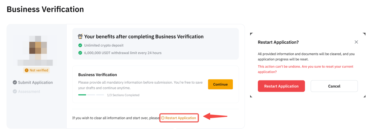 本人確認ページに移動して、申請のステータスを確認できます。情報不足により申請が失敗または却下された場合は、ページの却下理由を確認するか、必要に応じて必要な情報を添えて申請を再提出してください。または、申請を取り消してプロセスを再開することもできます。
