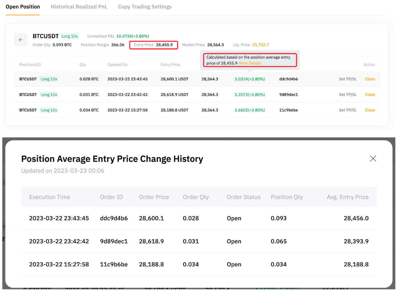 From the Open Position tab, he can see that the position average entry price is actually 28,455.90 USDT and this will be the base price used to calculate the unrealized or closed P&L. Follower A can hover his cursor over the underlined unrealized P&L and click on More Details to view the position average entry price change history.