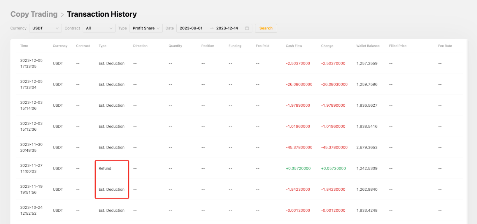 — As a follower, you will see the Est. Deduction is the profit share being pre-deducted from your earned profit. On the profit share settlement date, if there’s a net loss in the total P&L, the pre-deducted profit share will be sent to your Funding Account as a Refund on the settlement day. For more information, please refer to Copy Trading: Profit Sharing Explained.