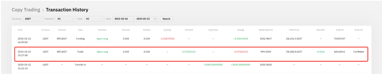 Follower A copied Master Trader B with a 1,000 USDT investment. A while later, he successfully copied a trade with this Master Trader. A 0.034 BTCUSDT long position is opened, with an order entry price of 28,188.80 USDT.