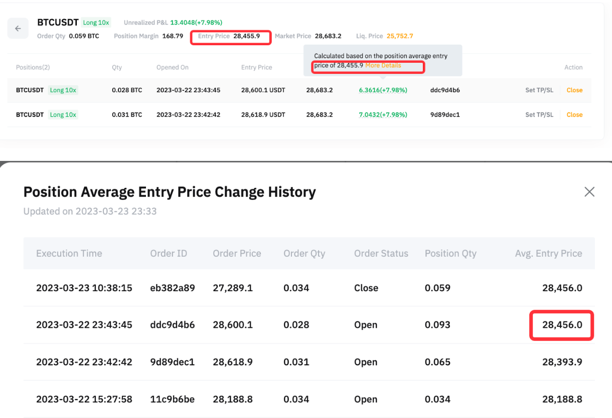 We can see the average entry price is still the same at 28,455.90 USDT as the average entry price will not be affected by the reduced position from closing.