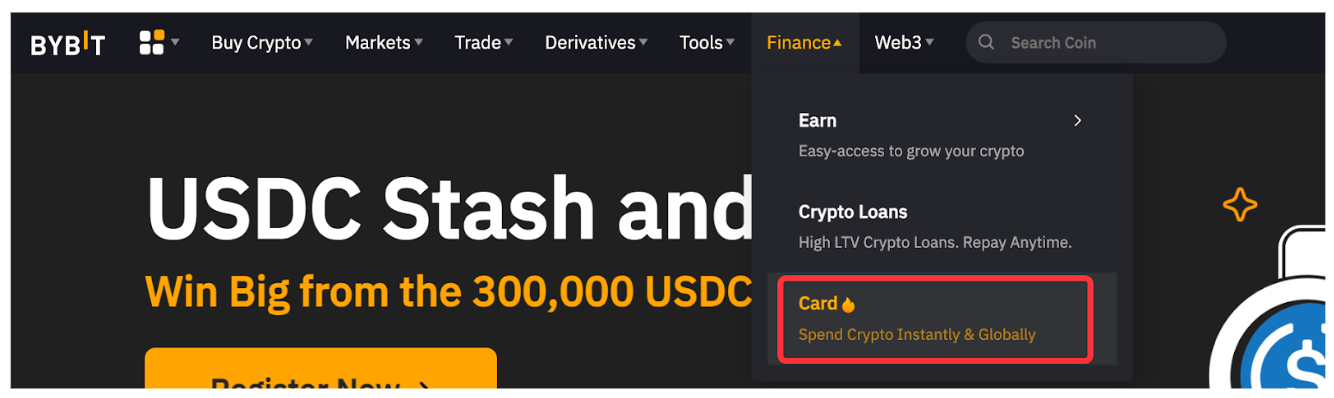 Step 1: Click on Finance in the upper left corner of the navigation bar on the Bybit page, then select Card to enter the Bybit Card page.