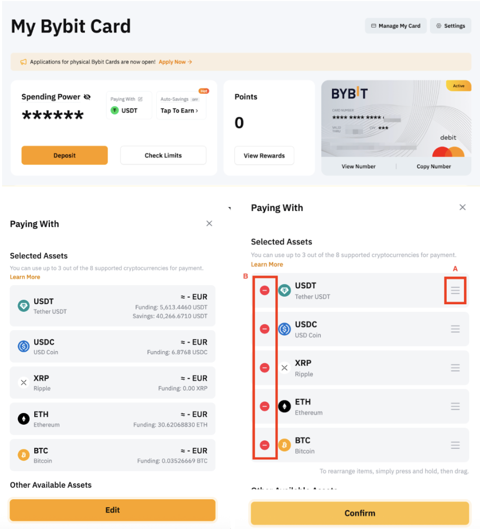 You can select up to 3 types of payment crypto for your Bybit Card transactions and the default payment priority is USDT > USDC >  BTC. However, you can manage your spending currencies, including adding, removing, or changing the order on the Card Dashboard page.