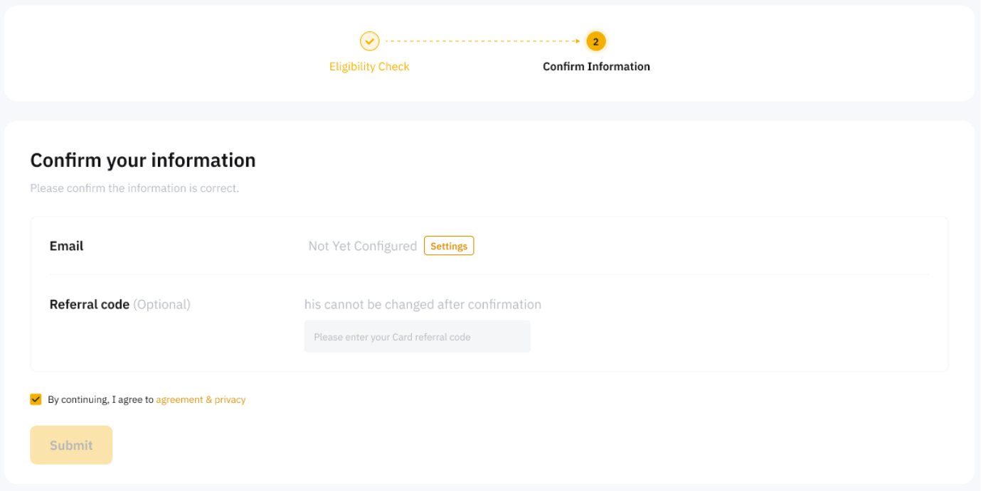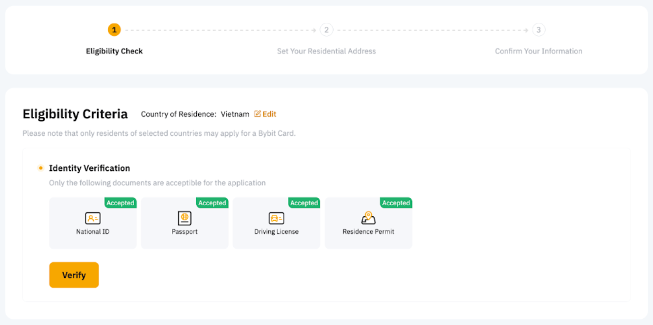 Note: Bybit Card has more stringent requirements for Identity Verification. Hence, you may be required to update your Identity Verification even though you have already completed it on your Bybit account previously.