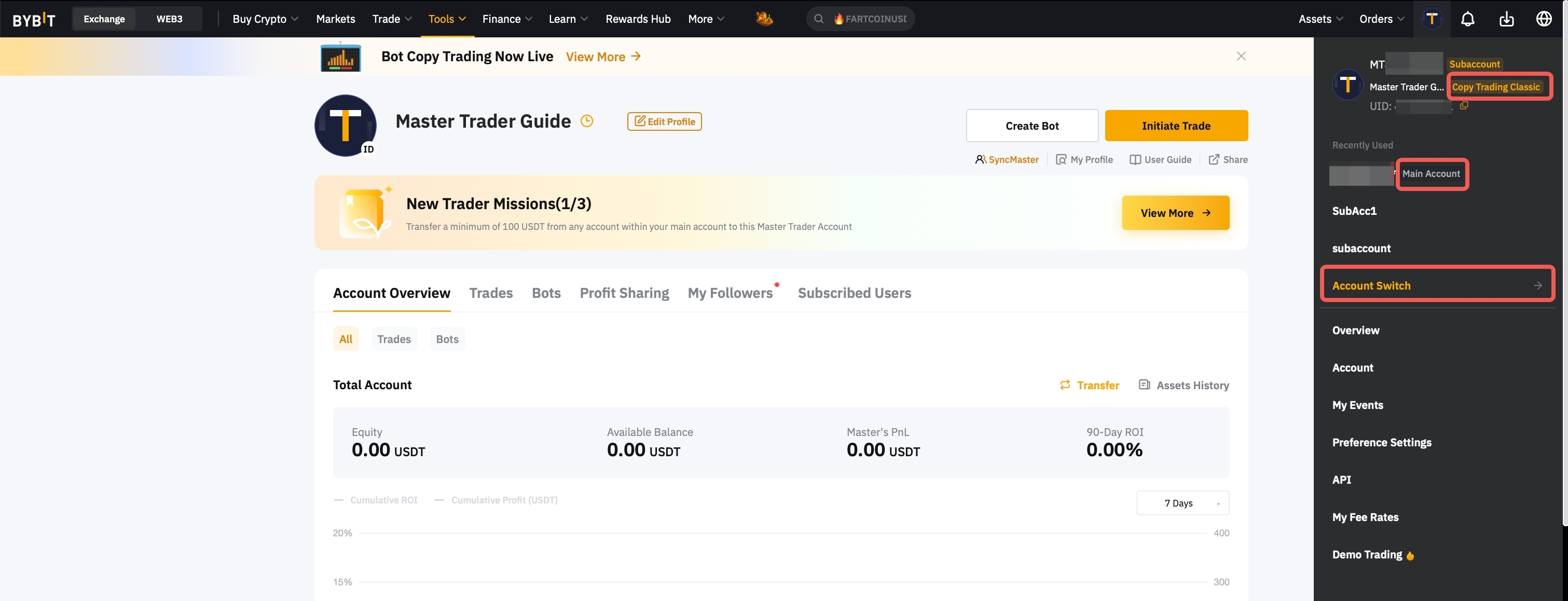 Upon successfully applying to be a Master Trader, it is required to complete the new Master Trader missions located within the Mission Center in order to be featured on the Bybit Copy Trading Recommended page.