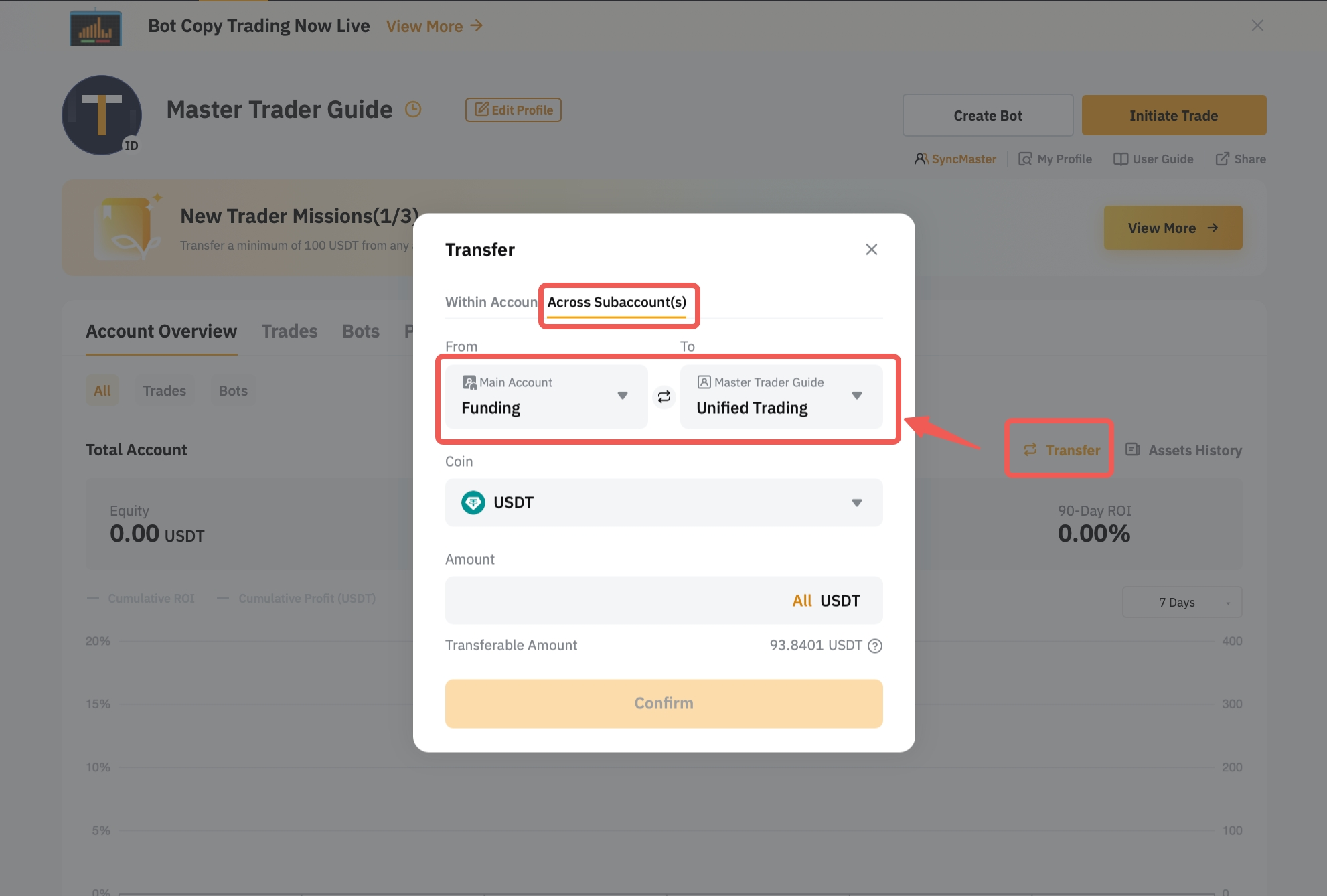 • Transfer to Master Trader Account: Transfer a minimum of 100 USDT from any account within your Main Account to this Master Trader Account