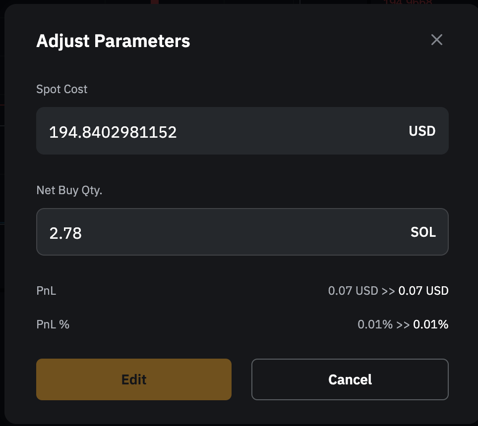 Step 2: In the Adjust Parameters pop-up, enter your new cost. You can also update the Net Buy Qty. if needed. Click Edit to save your changes or Cancel to discard them.