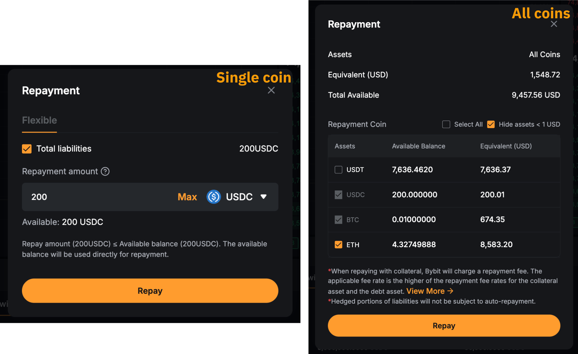 — If multiple repayment coins are selected, the system will auto-convert the repayment coins into the borrowed coin according to the liquidity order stated in the Margin Specifications.
