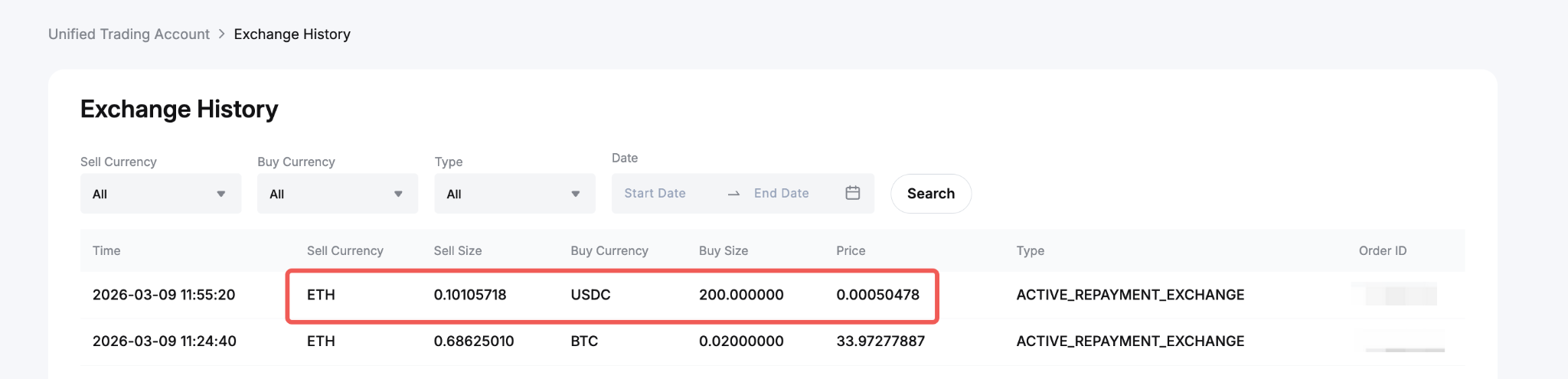 In your Transaction Log, you can find details for each repayment under the Convert and Repay transaction types—sequentially listed with identical timestamps and Order IDs. Convert transactions indicate any auto-conversions of selected collateralized assets to repay the borrowed amount. It will only appear if you have an insufficient borrowed coin in your balance for repayment, and conversions are necessary. Meanwhile, Repay transactions display the amount you have paid for your borrowed coin.