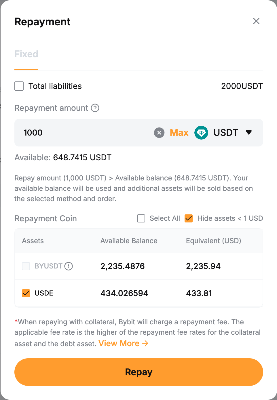 If you have insufficient borrowed coins, you can make a full repayment with other collateral assets. The system will convert collateral to repay the borrowed coins, and a 0.1% handling fee will apply.