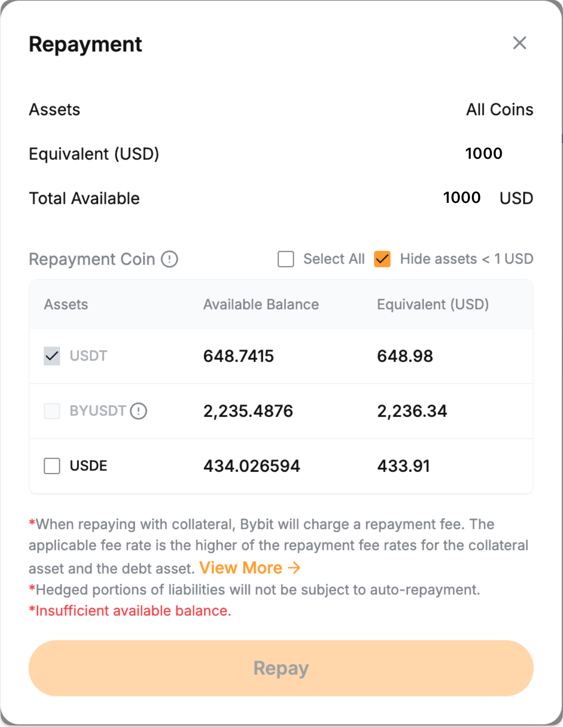 If you have insufficient borrowed coins, you can make a full repayment with other collateral assets. The system will convert collateral to repay the borrowed coins, and the handling fee will apply. The fee rate is the higher of the repayment fee rates for the collateral asset and the debt asset.