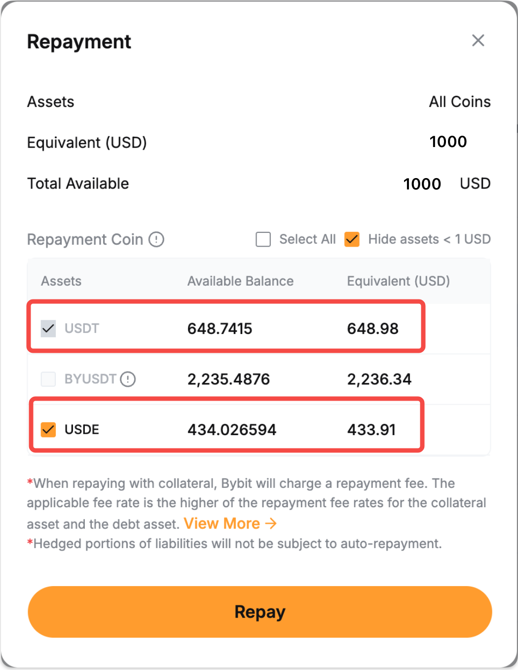 If you have insufficient borrowed coins, the system will use your available borrowed coin for repayment.