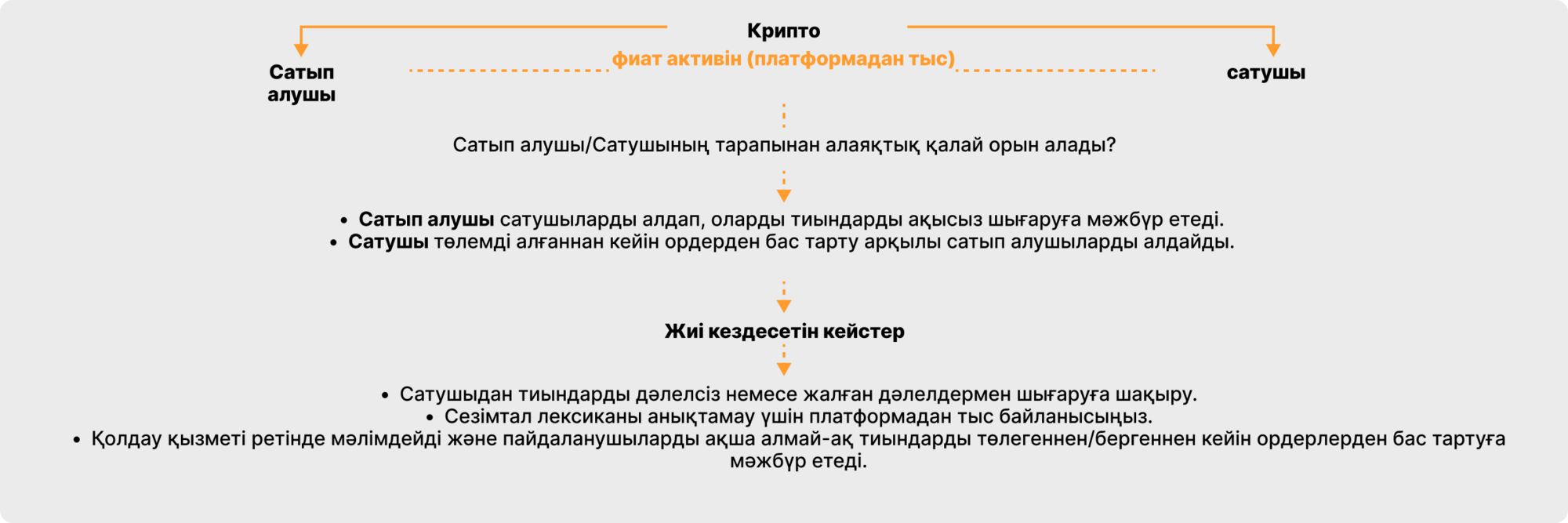 P2P транзакция моделінде төлемдер платформадан тыс жүзеге асырылады, бұл бақылау мен тексеруді қиындатады. Бұл алаяқтық әрекеттерге жол ашады, өйткені пайдаланушыларға төлем мәртебесін растау және контрагенттердің тұтастығын бағалау қиынға соғады, осылайша алаяқтық қаупі артады.