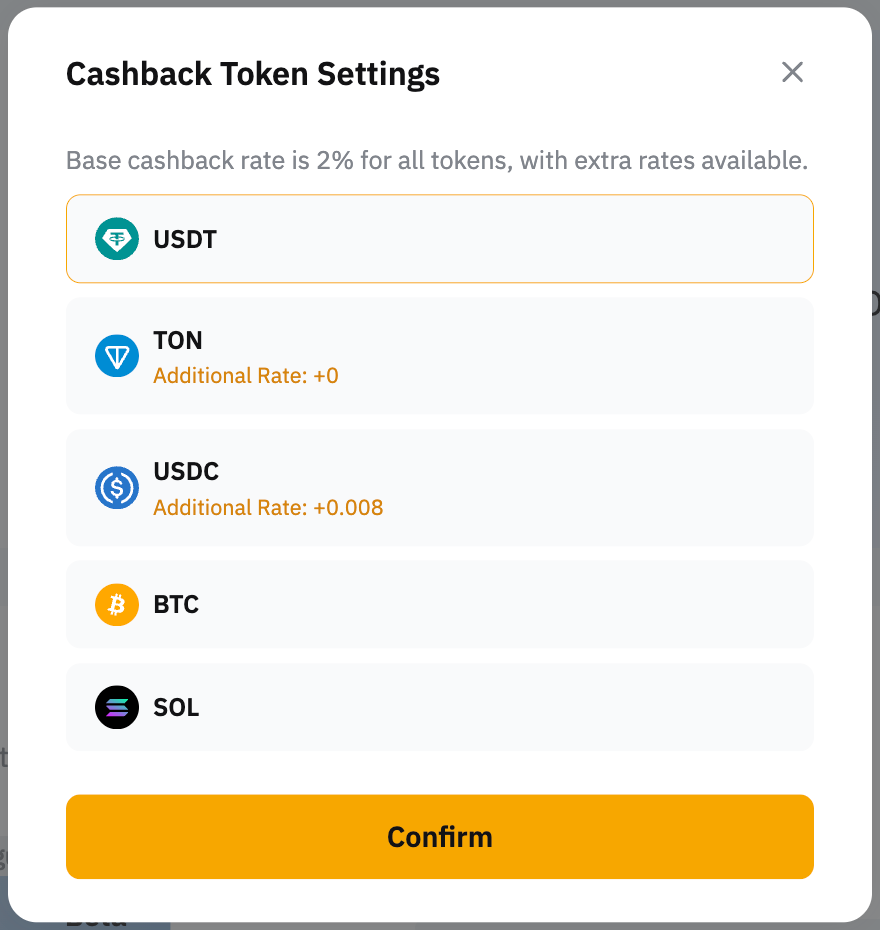 • If you would like to change the cashback token to another, tap on the coin icon and select the auto-cashback token you wish to receive.