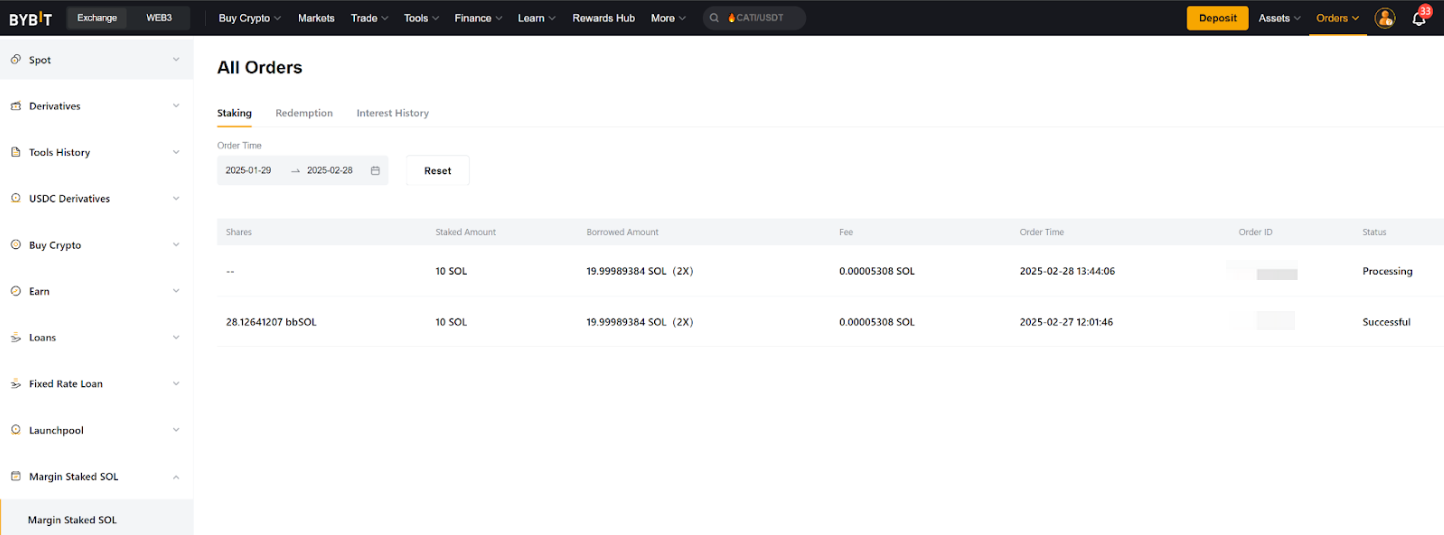 Step 2: On the Margin Staked SOL Orders page, you'll find more details under Staking, Redemption, and Interest History.