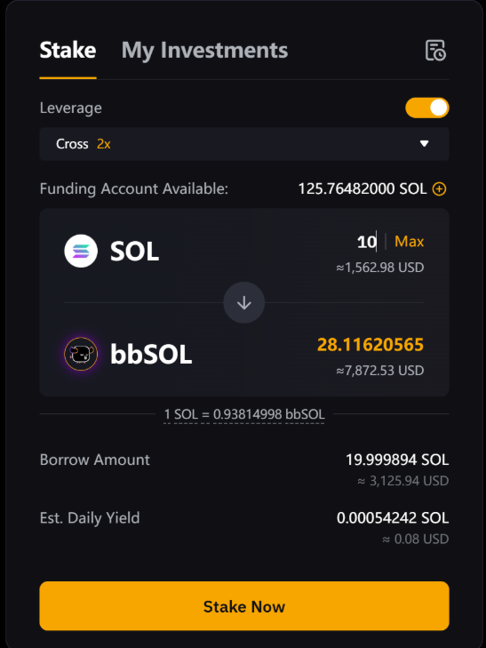 Enable it to borrow funds with a leverage of up to 2x, or disable it to stake only your principal. It is turned on by default.