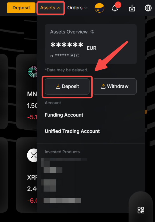 Alternatively, you may also hover your cursor over Assets at the top right-hand corner of the Bybit homepage. Then, click on Deposit to enter the deposit page.