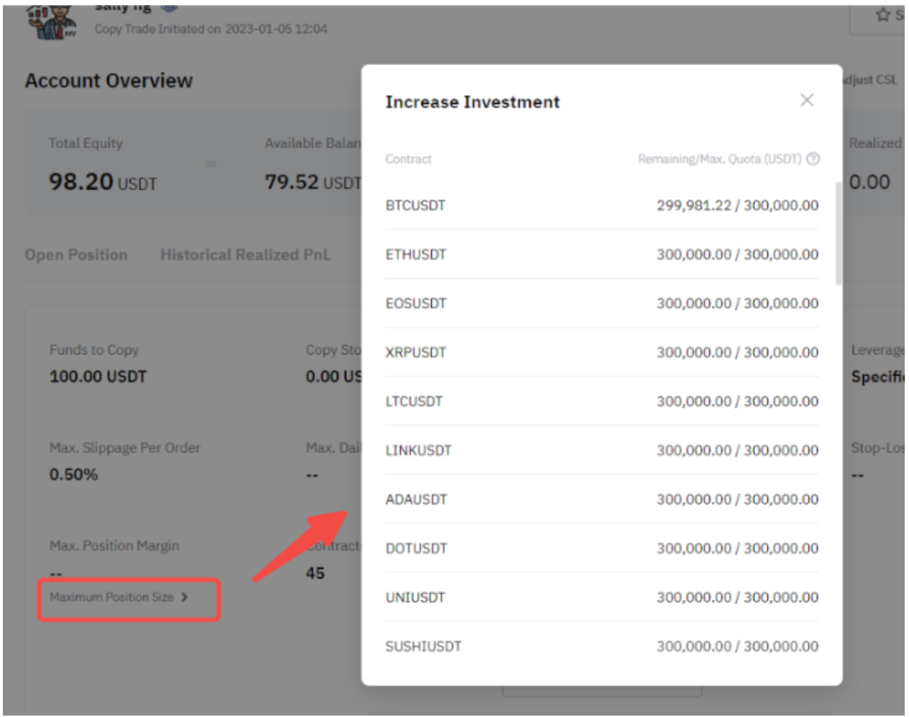 The maximum position size shows the remaining and maximum order value that can be followed for your copy trades derived from your position sizes in both long and short directions.