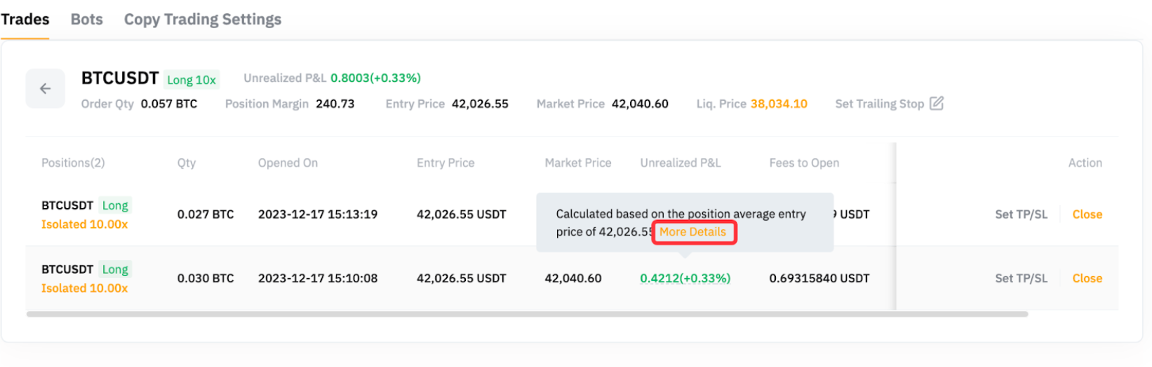 Please note that the Entry Price displayed in the position details is the position average entry price. To check how the position entry price is derived, you can move your cursor to the Unrealized P&L and click on More Details to see the Position Average Entry Price Change History.