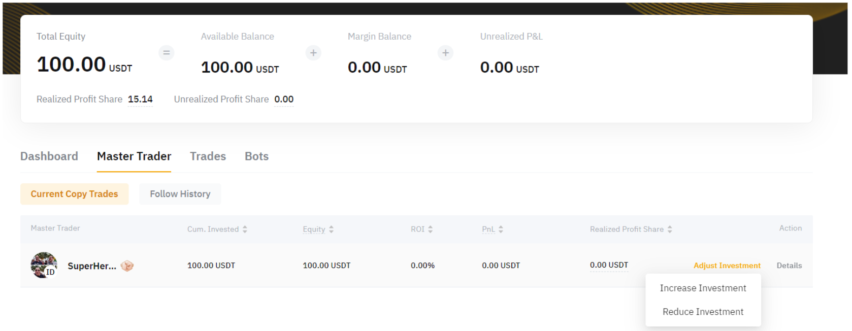 You can view the Current Copy Trades and Follow History of each Master Trader. You can also click on Adjust Investment to increase or reduce your funds to copy the respective Master Trader. Please note that the amount reduced will be automatically transferred to your Funding Account.