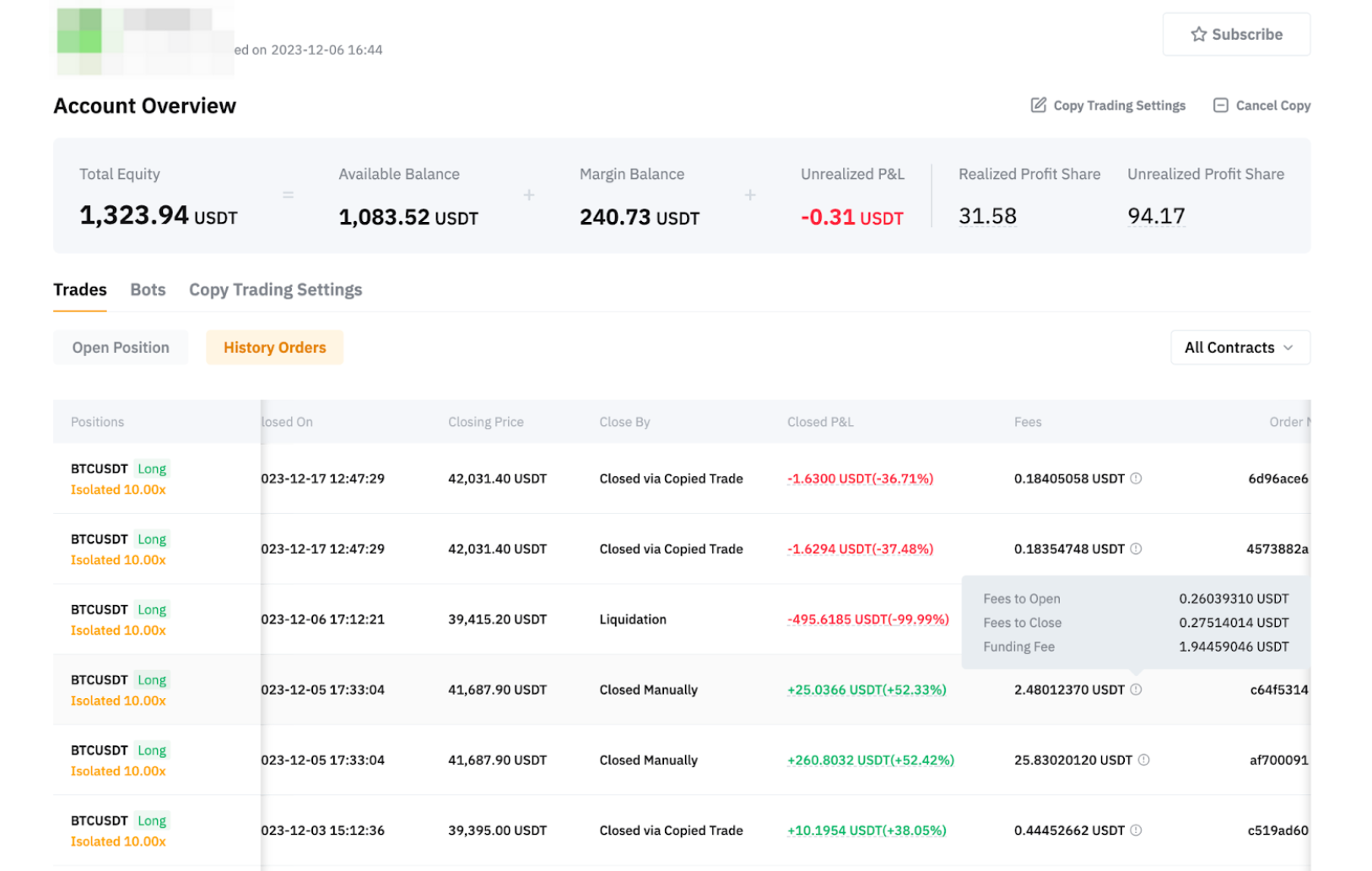 From the Copy Trading User Center (Follower), you can have an overview of your Copy Trading Account, the current or past performance of your followed Master Trader and the order details.