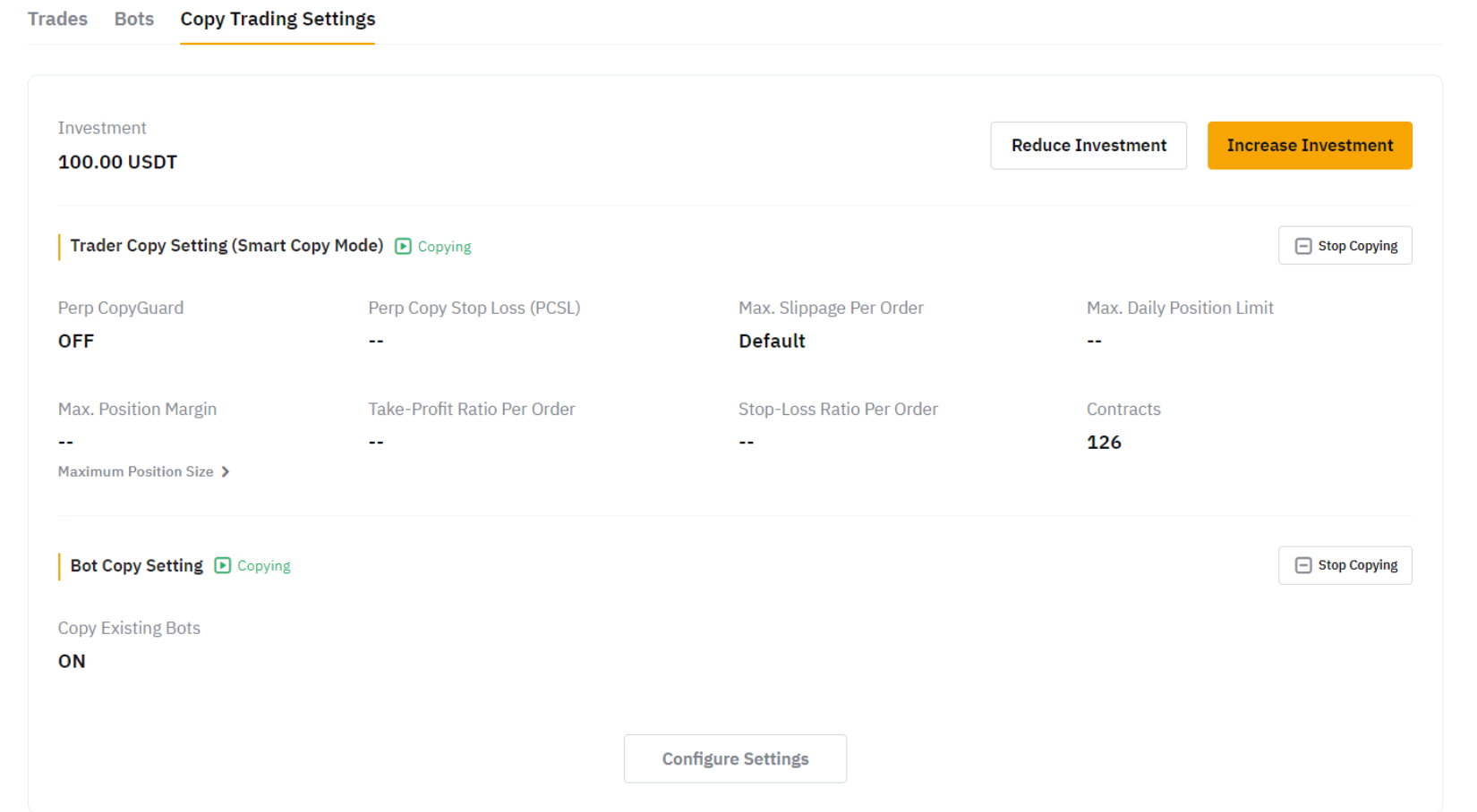 This includes positions from the copied USDT Perpetual trades or positions within the copied Trading Bot.
