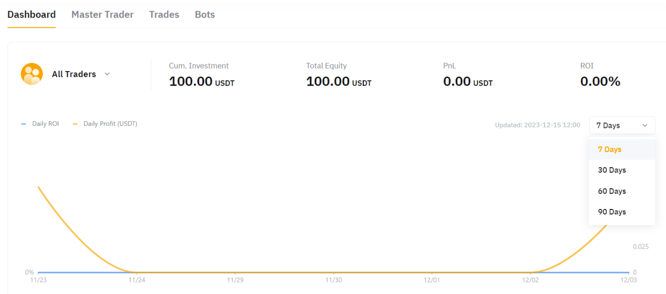 You can view the results of the current P&L and ROI of all following Master Traders, or you can filter each Master Trader to view the results individually.