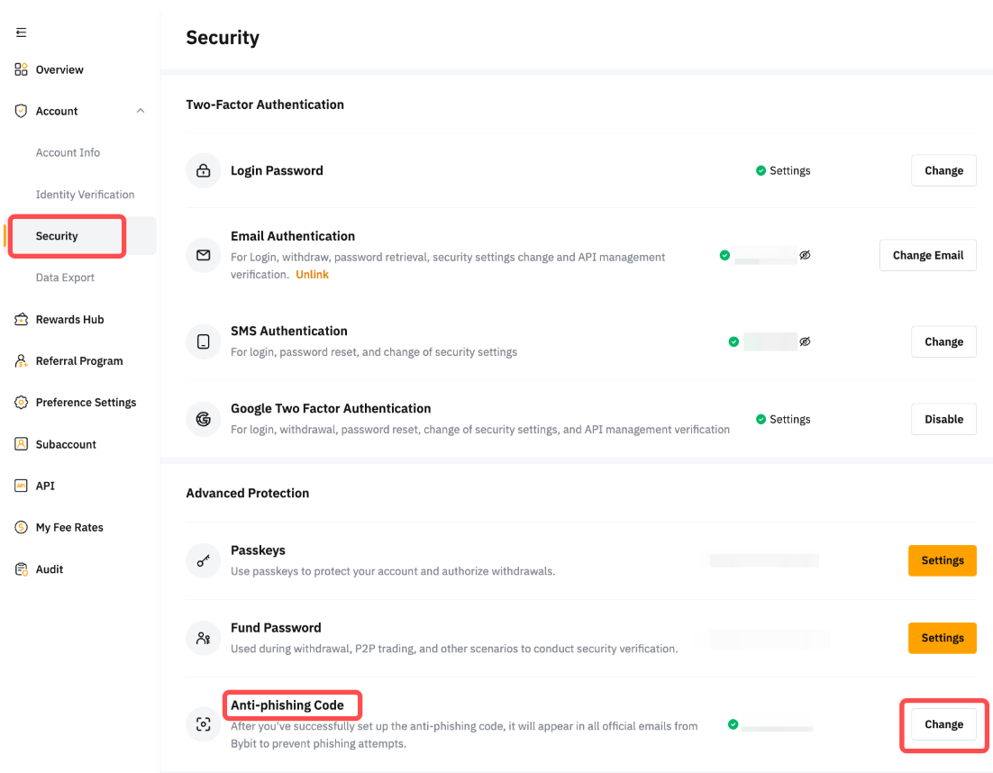 To modify your current Anti-phishing Code on Bybit, tap on Security and click on the Change button under the Anti-phishing Code configuration.