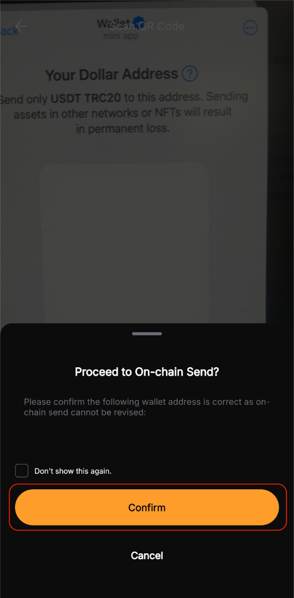 – Confirme se o endereço da carteira está correto antes de prosseguir, pois as transações na cadeia são irreversíveis depois de enviadas.