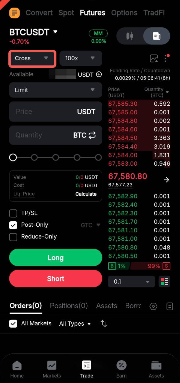 Você pode alternar seu modo de margem em qualquer página de trading ou página de ativos da Conta de Trading Unificado. Observe que, para alternar para o modo de margem cruzada, a alavancagem e o limite de risco usados para posições bidirecionais (posições long e short) devem ser os mesmos. Caso contrário, a troca falhará. Para obter mais informações, consulte os critérios para alternar os modos de margem indicados aqui.