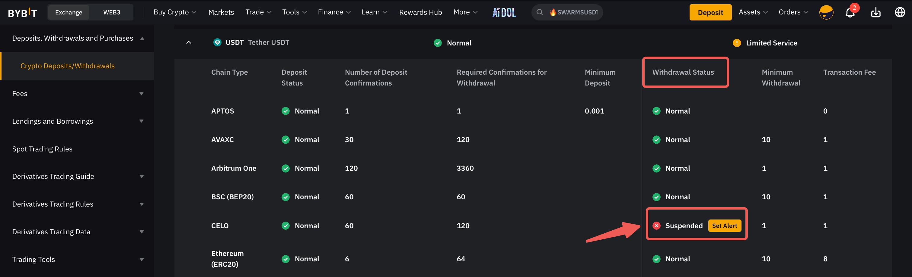 Alternatively, you can go to the Deposit/Withdrawal status page and search for the token and chain. The Set Alert button will be visible next to the “Suspended” deposit status.