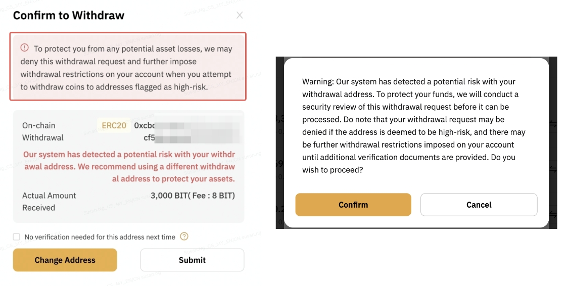 If you still wish to proceed with the same address, the withdrawal request may be rejected if the address is deemed high-risk. Your account may be imposed a withdrawal restriction until additional verification documents are provided via email, if required.
