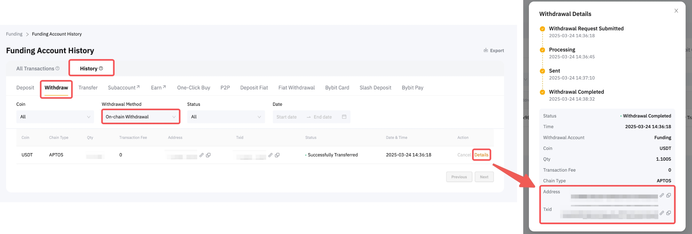 You can check your withdrawal status and details from Funding Account History → Withdraw.