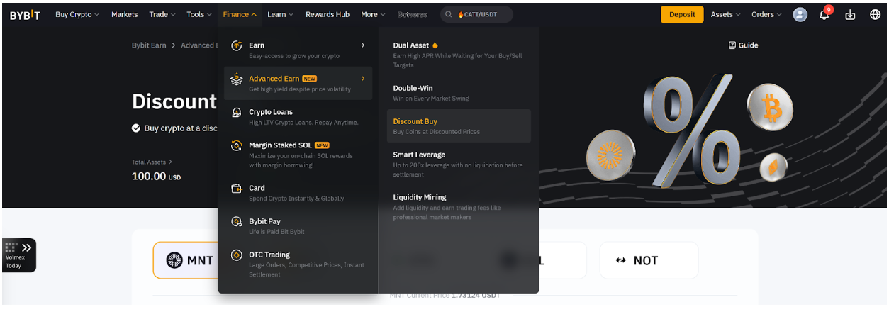 Step 1: Hover your cursor over Finance at the top navigation bar of the Bybit home page. Then click on Advanced Earn → Discount Buy