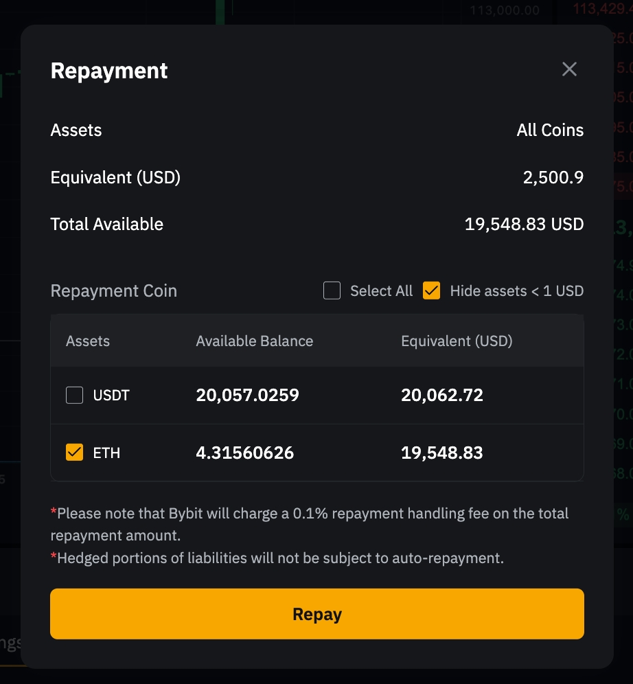 Upon confirmation, the system will use your available borrowed coin for repayment first. Any remaining liabilities will be repaid by converting collateral assets into the borrowed currency. If the repayment requires conversion, Bybit will charge a 0.1% handling fee on the total repayment amount.
