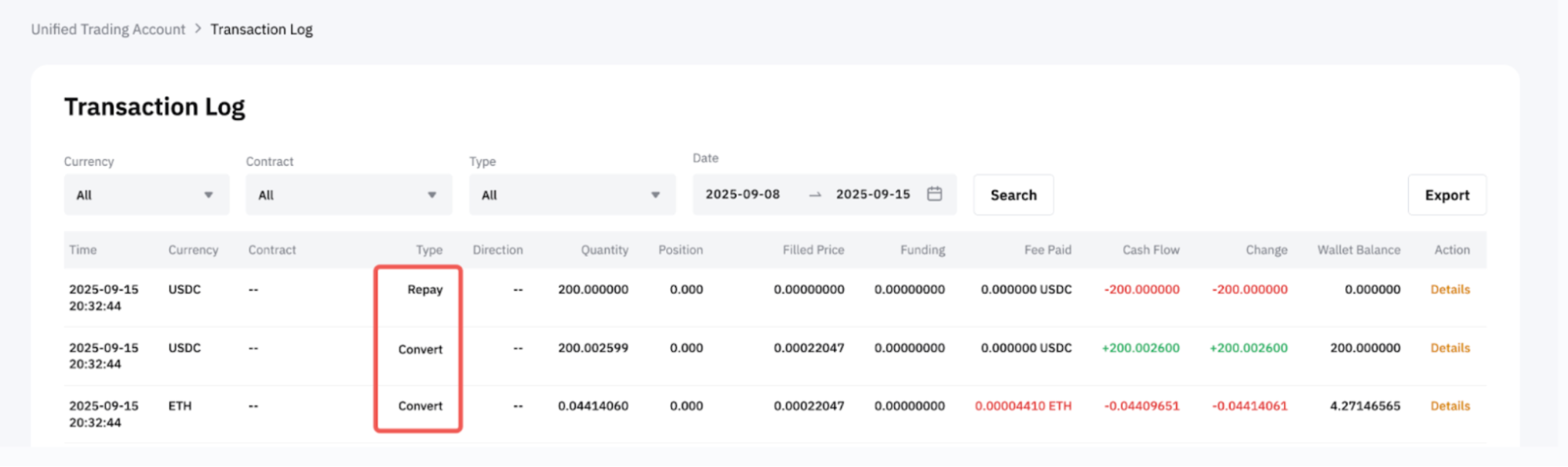 In your Transaction Log, you can find details for each repayment under the Convert and Repay transaction types—sequentially listed with identical timestamps and Order IDs. Convert transactions indicate any auto-conversions of selected collateralized assets to repay the borrowed amount. It will only appear if you have an insufficient borrowed coin in your balance for repayment, and conversions are necessary. Meanwhile, Repay transactions display the amount you have paid for your borrowed coin.