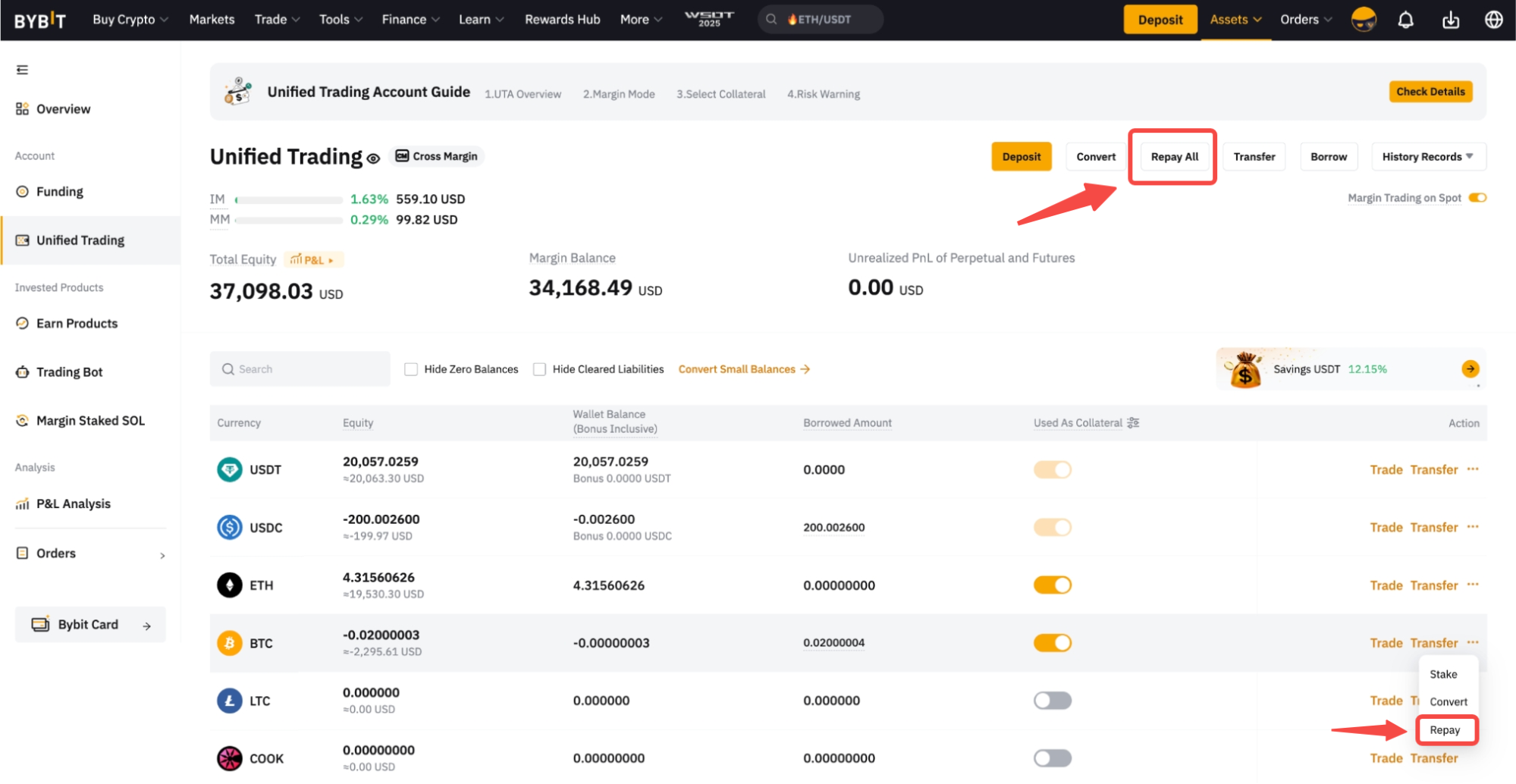 • To repay all borrowed coins, click on Repay All at the top of the Unified Trading page.
