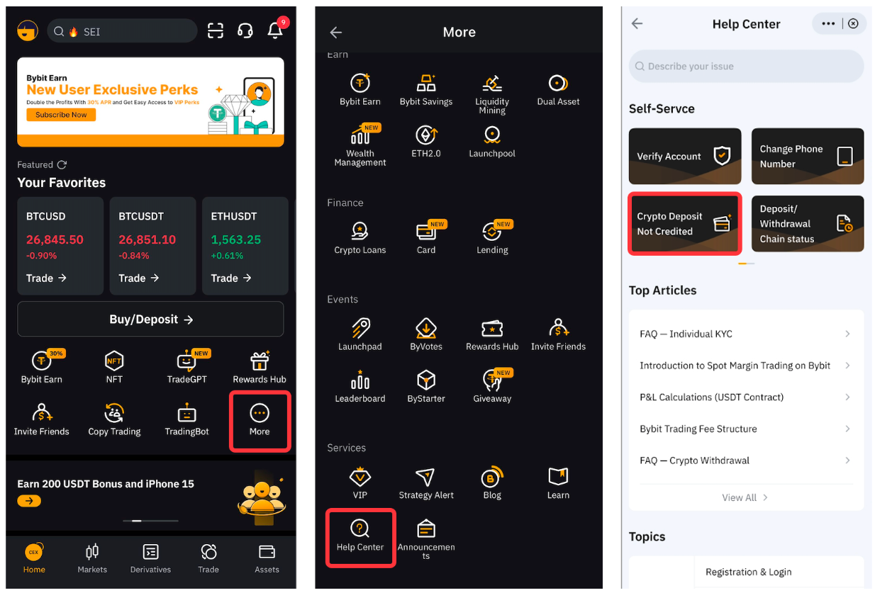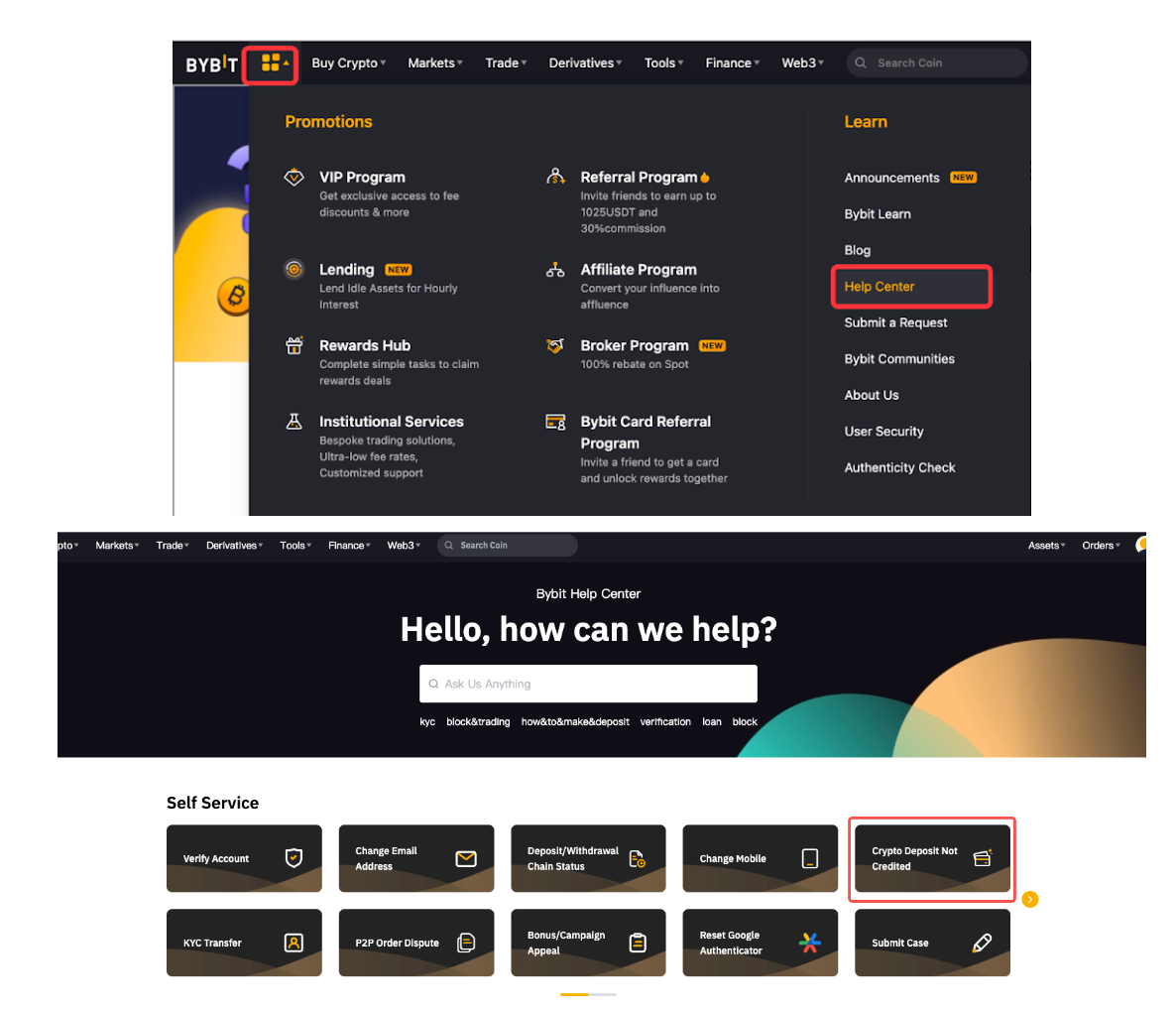 Step 1: Hover to the upper left corner to look for Help Center → Select Crypto Deposit not credited, and you will be redirected to the Self-Service page.