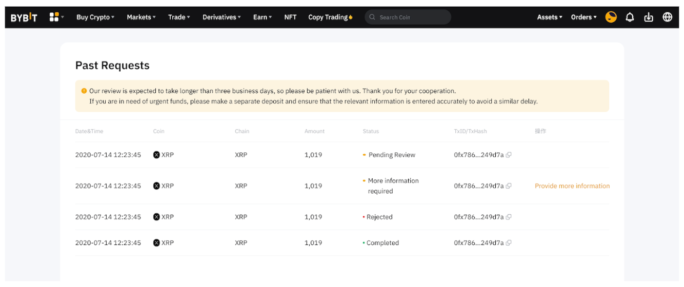 For example, you made a withdrawal from Exchange A to Bybit, kindly log in to Exchange A and show us the withdrawal details.