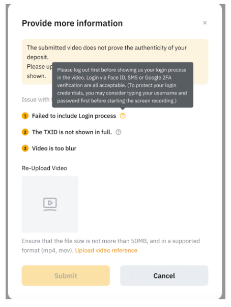 Step 2: You will be prompted to resubmit a video with the requested information. The respective solution can be found when you hover over the question mark icon.
