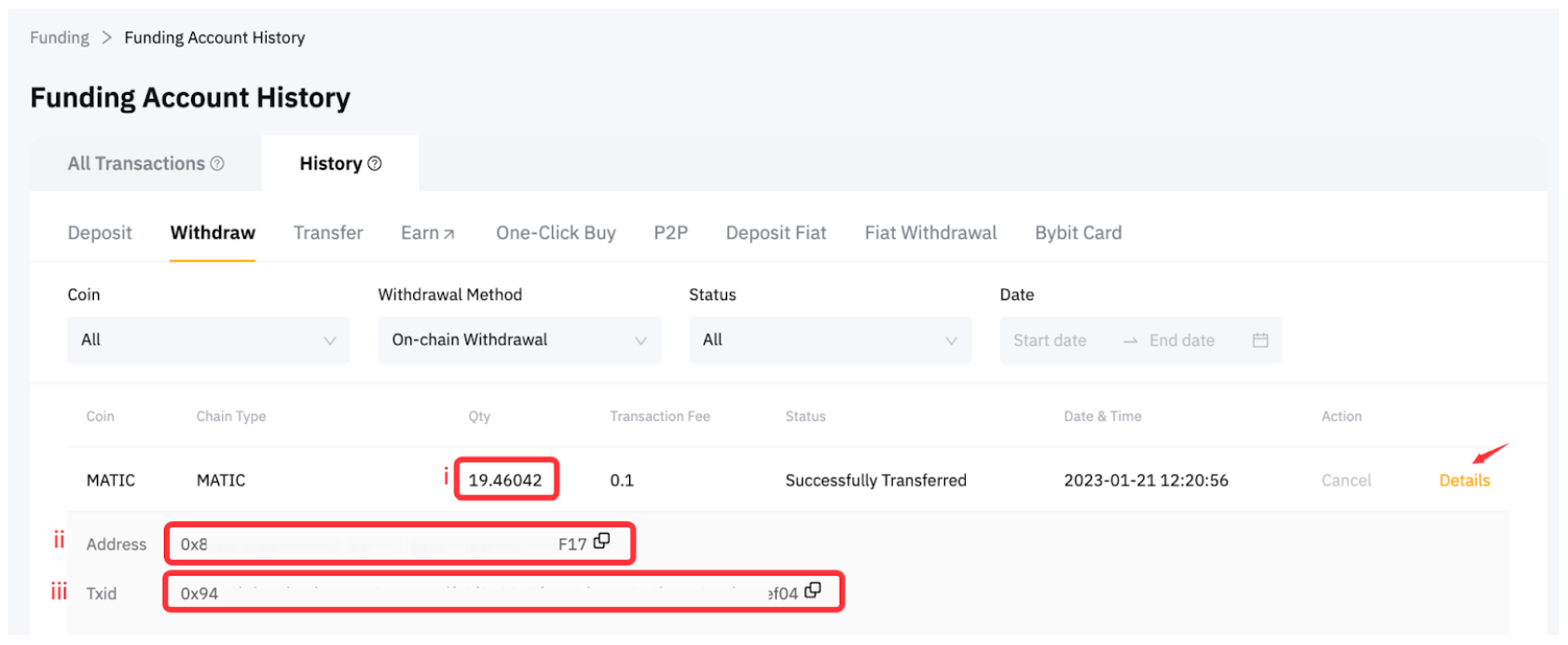 c. Details of your withdrawal from Bybit - The details can be found here.