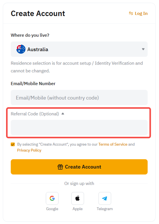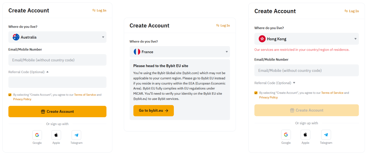 Вы также можете нажать кнопки Зарегистрироваться с, чтобы легко создать свою учетную запись Bybit, используя: