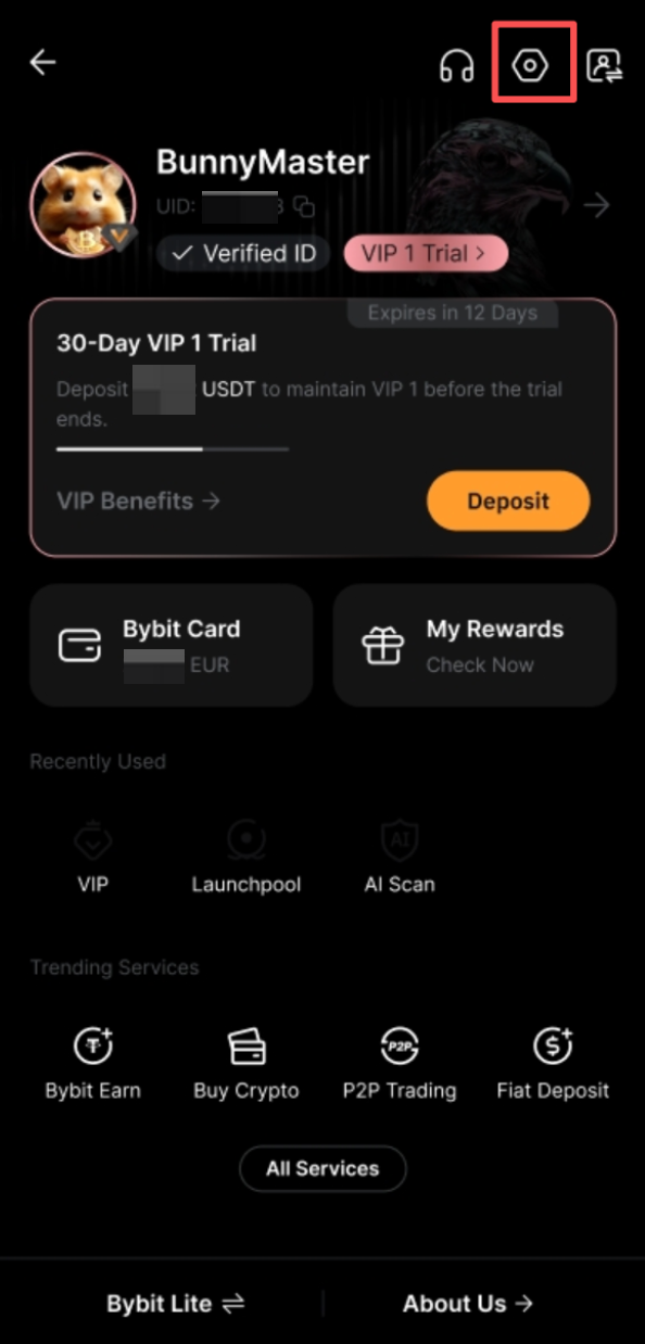 Шаг 1: Откройте приложение Bybit, нажмите на изображение своего профиля в левом верхнем углу, а затем нажмите на значок «Настройки», чтобы открыть «Центр пользователя».