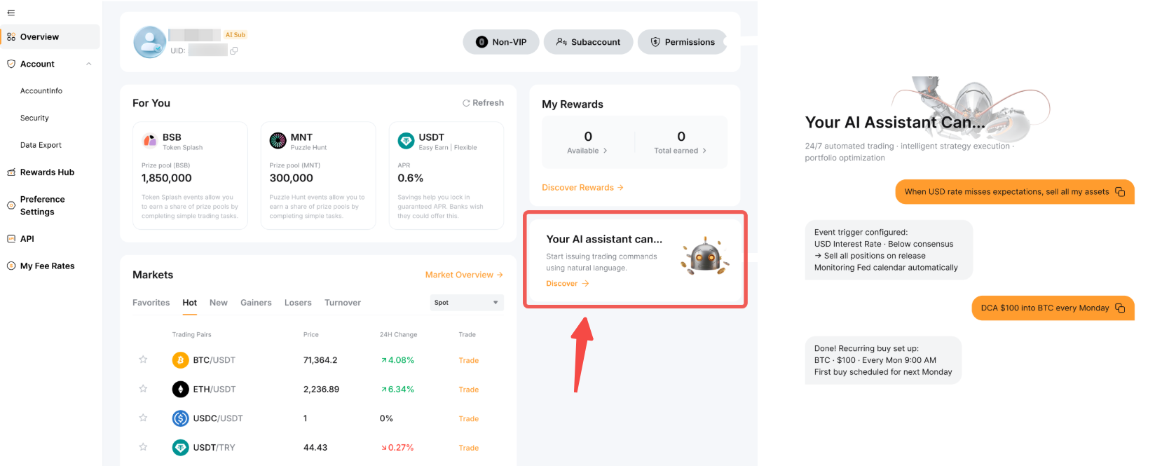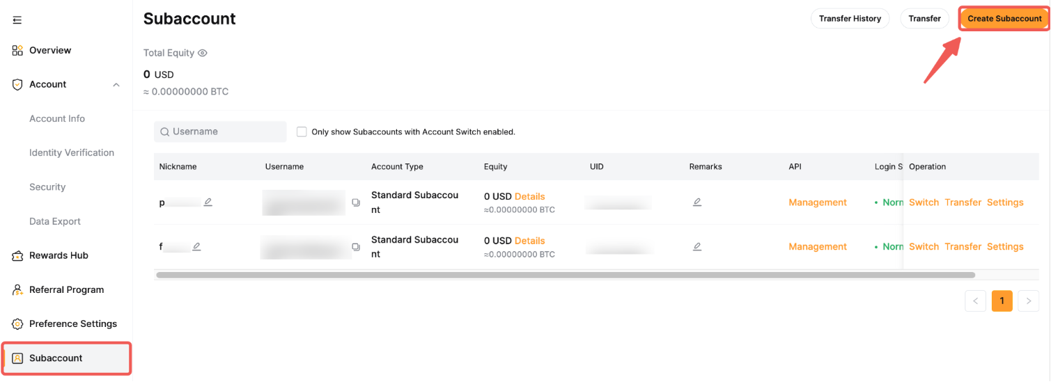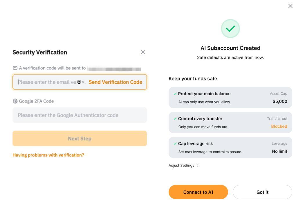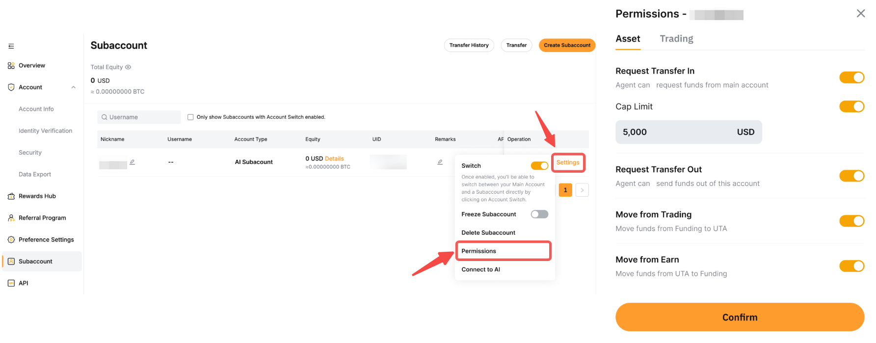 После настройки субаккаунта ИИ вы сможете управлять его разрешениями. Для защиты вашего аккаунта и доступа к API, пожалуйста, переключитесь на основной аккаунт, чтобы изменить эти настройки.