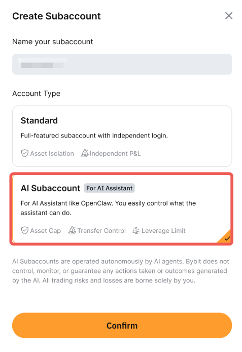 Шаг 2: Введите имя субаккаунта и выберите AI субаккаунт, затем нажмите Подтвердить.