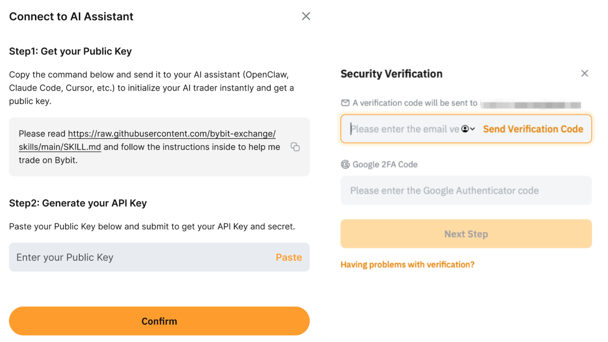 Получите ваш публичный ключскопировав указанную команду и отправив ее вашему AI-ассистенту, например, Open Claw, Claude Code, Cursor и т.д. После завершения вы можете сгенерировать ваш API ключвставив публичный ключ, чтобы получить ваш API ключ и секрет.