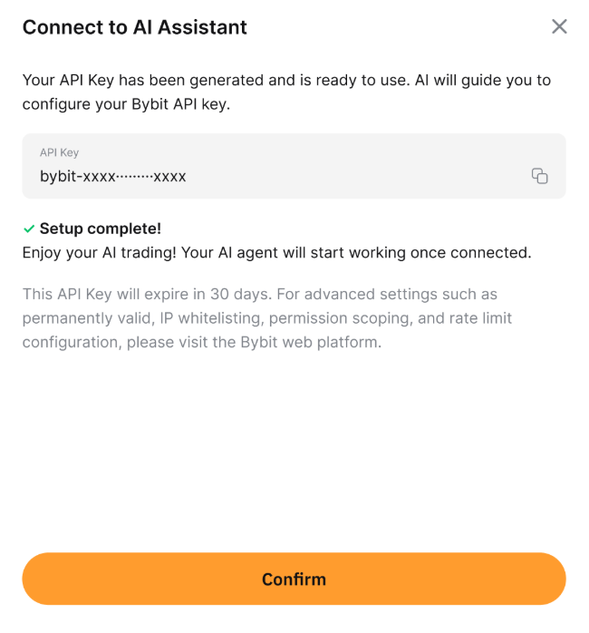 Настройка завершена! Ваш API ключ сгенерирован и готов к использованию. Пожалуйста, следуйте руководству вашего ИИ-ассистента для настройки вашего Bybit API ключа.