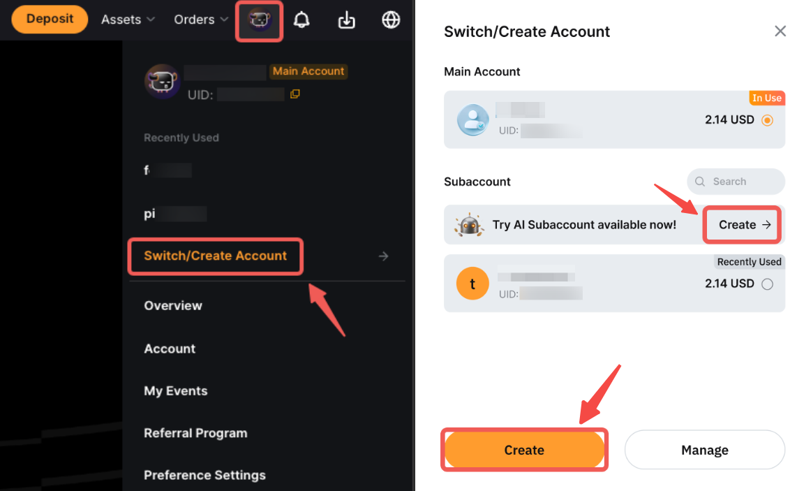 Вы также можете создать субаккаунт через меню «Переключить аккаунт». Чтобы создать ИИ-субаккаунт, просто нажмите создать в разделе Попробовать ИИ-субаккаунт.